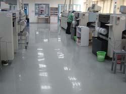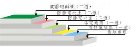 ①防水處理: 一樓地面需已做好防水處理; ②素地處理: 依素地狀況做好打磨、修補、除塵; ③防靜電底漆:采用滲透性及附著力特強防靜電環(huán)氧底漆滾涂一道,增強表面附著 力; ④防靜電中涂:防靜電中涂將環(huán)氧樹脂加入適量的石英砂,用鏝刀將其均勻涂布一至 二道; ⑤銅箔鋪設(shè): 導(dǎo)電銅箔采用井型鋪設(shè),有效排除累積之靜電,并做接地處理; ⑥防靜電批土:防靜電批土依實際需要施工數(shù)道,要求達到平整無孔洞,無批刀印及 砂磨印為準(zhǔn); ⑦防靜電面漆:防靜電面漆滾涂二道,其體積/表面電阻平均系數(shù)值1X10^6~1X10^9Ω,完工后整體地面光亮潔凈,顏色均一,無空鼓; ⑧施工完成: 24小時后方可上人,72小時后方可重壓。(25℃為準(zhǔn),低溫時開放 時間需適度延長)