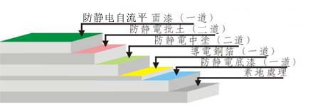 ①防水處理: 一樓地面需已做好防水處理; ②素地處理: 依素地狀況做好打磨、修補(bǔ)、除塵; ③防靜電底漆:采用滲透性及附著力特強(qiáng)防靜電環(huán)氧底漆滾涂一道,增強(qiáng)表面附著 力; ④防靜電中涂:防靜電中涂將環(huán)氧樹脂加入適量的石英砂,用鏝刀將其均勻涂布一至 二道; ⑤銅箔鋪設(shè): 導(dǎo)電銅箔采用井型鋪設(shè),有效排除累積之靜電,并做接地處理; ⑥防靜電批土:防靜電批土依實(shí)際需要施工數(shù)道,要求達(dá)到平整無孔洞,無批刀印及 砂磨印為準(zhǔn); ⑦防靜電面漆:防靜電面漆滾涂二道,其體積/表面電阻平均系數(shù)值1X10^6~1X10^9Ω,完工后整體地面光亮潔凈,顏色均一,無空鼓; ⑧施工完成: 24小時(shí)后方可上人,72小時(shí)后方可重壓。(25℃為準(zhǔn),低溫時(shí)開放 時(shí)間需適度延長(zhǎng))