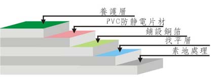 在PVC材料中加入永久性導(dǎo)電材料、使得產(chǎn)品擁有永久的消除及防止靜電或電磁波產(chǎn)生,避免靜電火花及電磁波干擾及破壞,且耐磨損,防塵,易清洗,耐火性能優(yōu)。 |